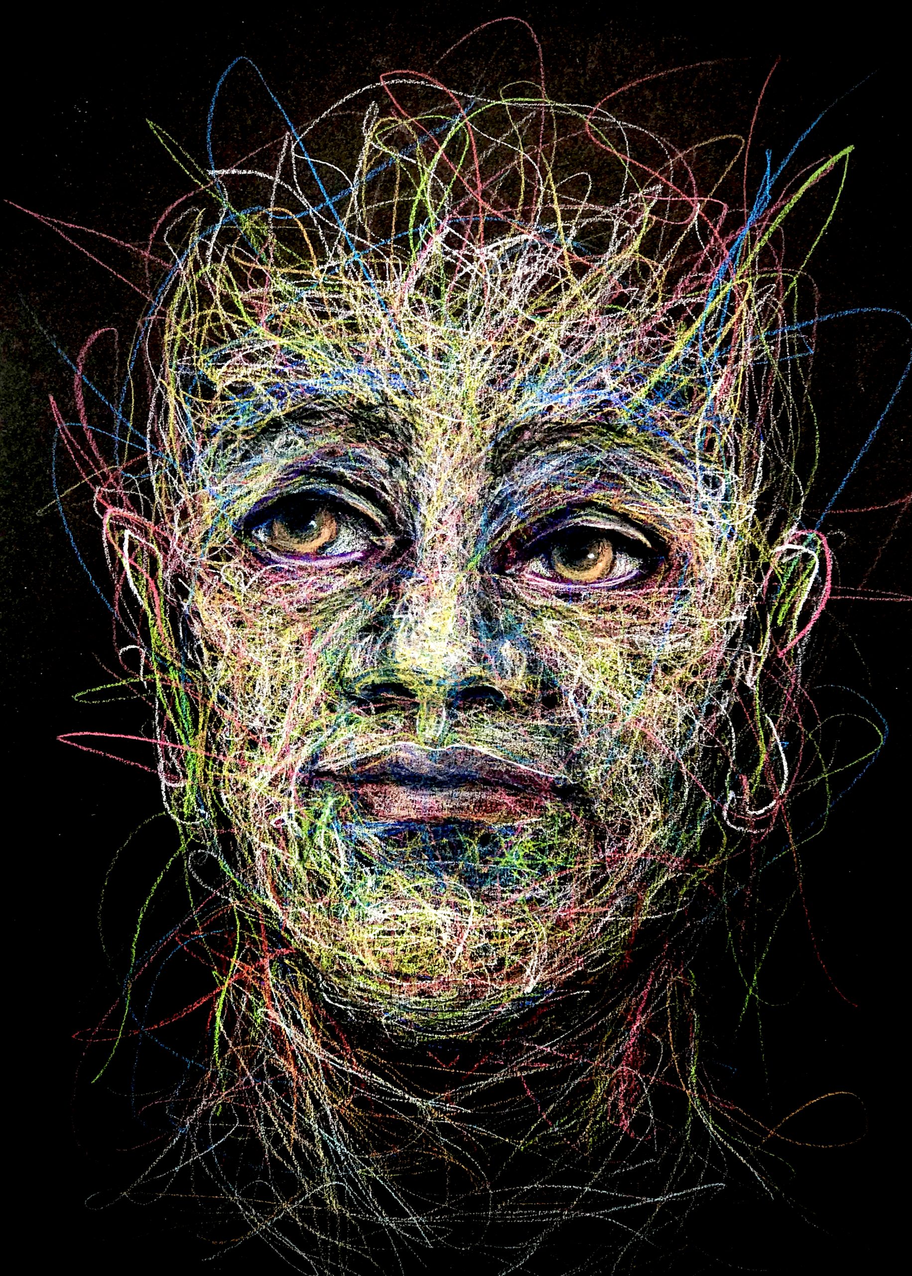 Continuous line scribble drawing on Daler Rowney black paper, using Derwent crayons