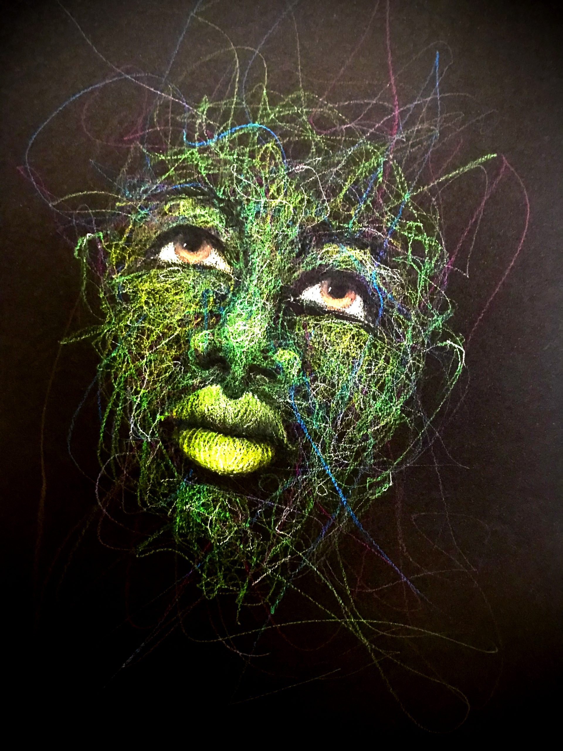 Continuous line scribble drawing on Daler Rowney black paper, using Derwent crayons