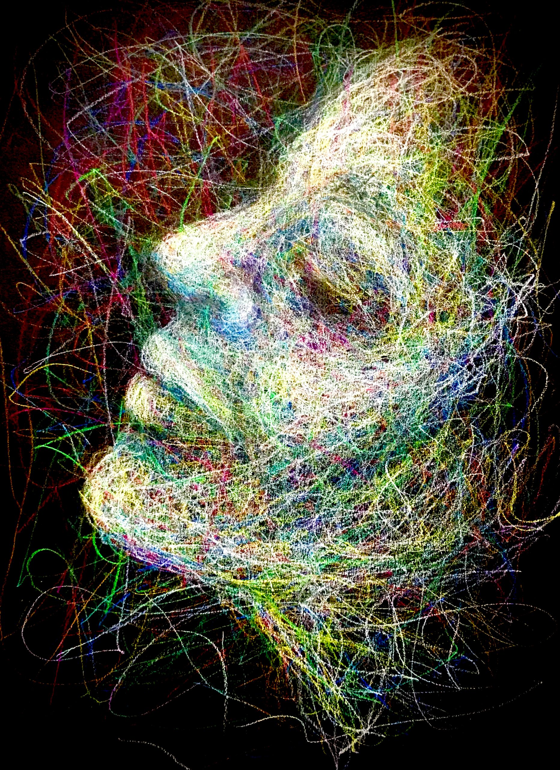 Continuous line scribble drawing on Daler Rowney black paper, using Derwent crayons
