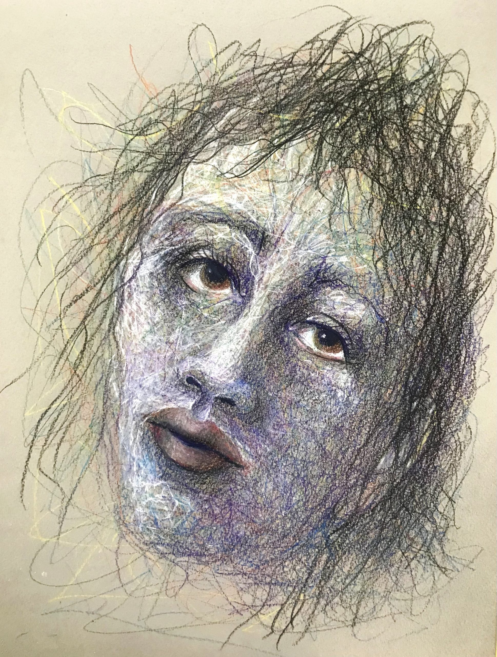 Continuous line scribble drawing on Daler Rowney pastel paper, using Derwent crayons