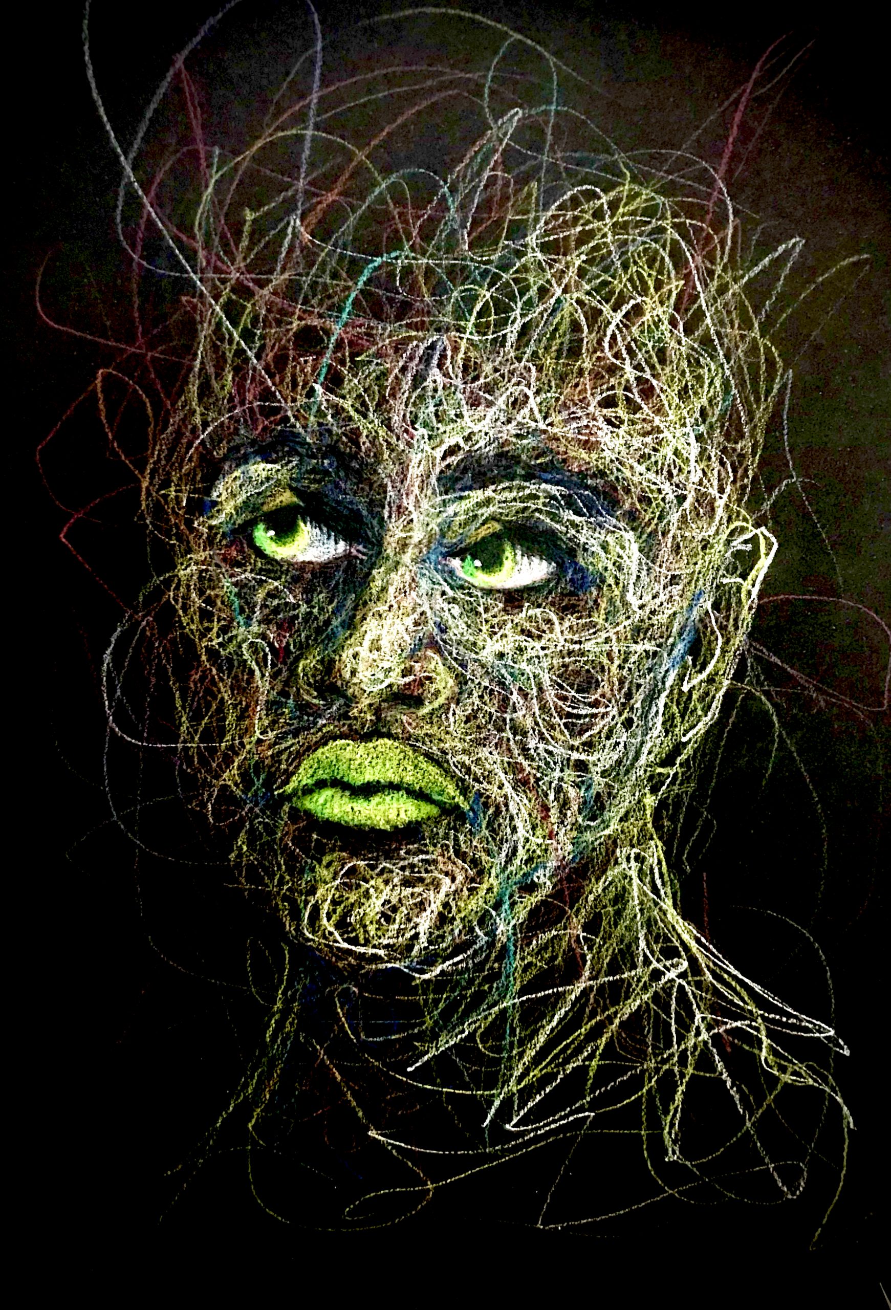 Continuous line scribble drawing on Daler Rowney black paper, using Derwent crayons