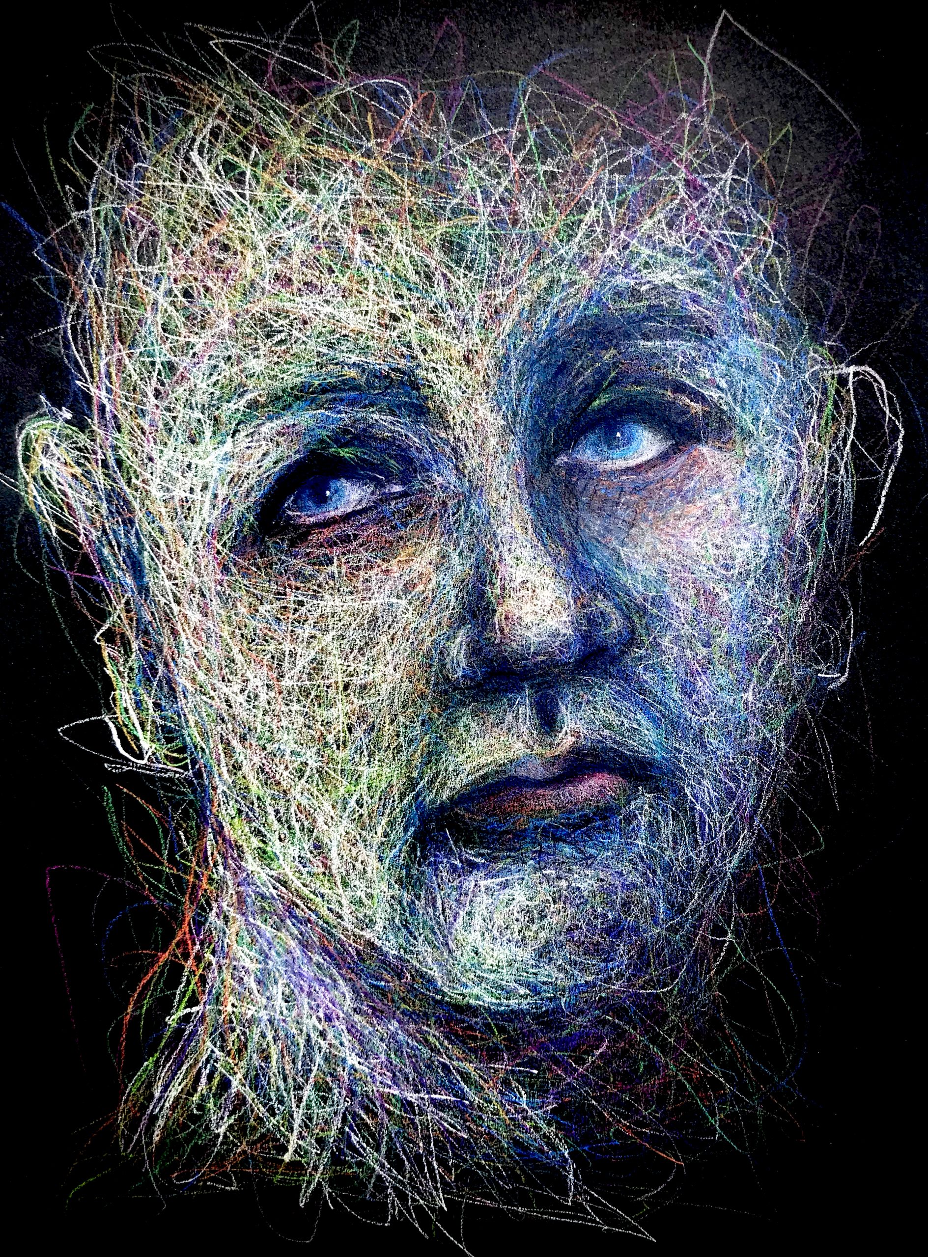 Continuous line scribble drawing on Daler Rowney black paper, using Derwent crayons