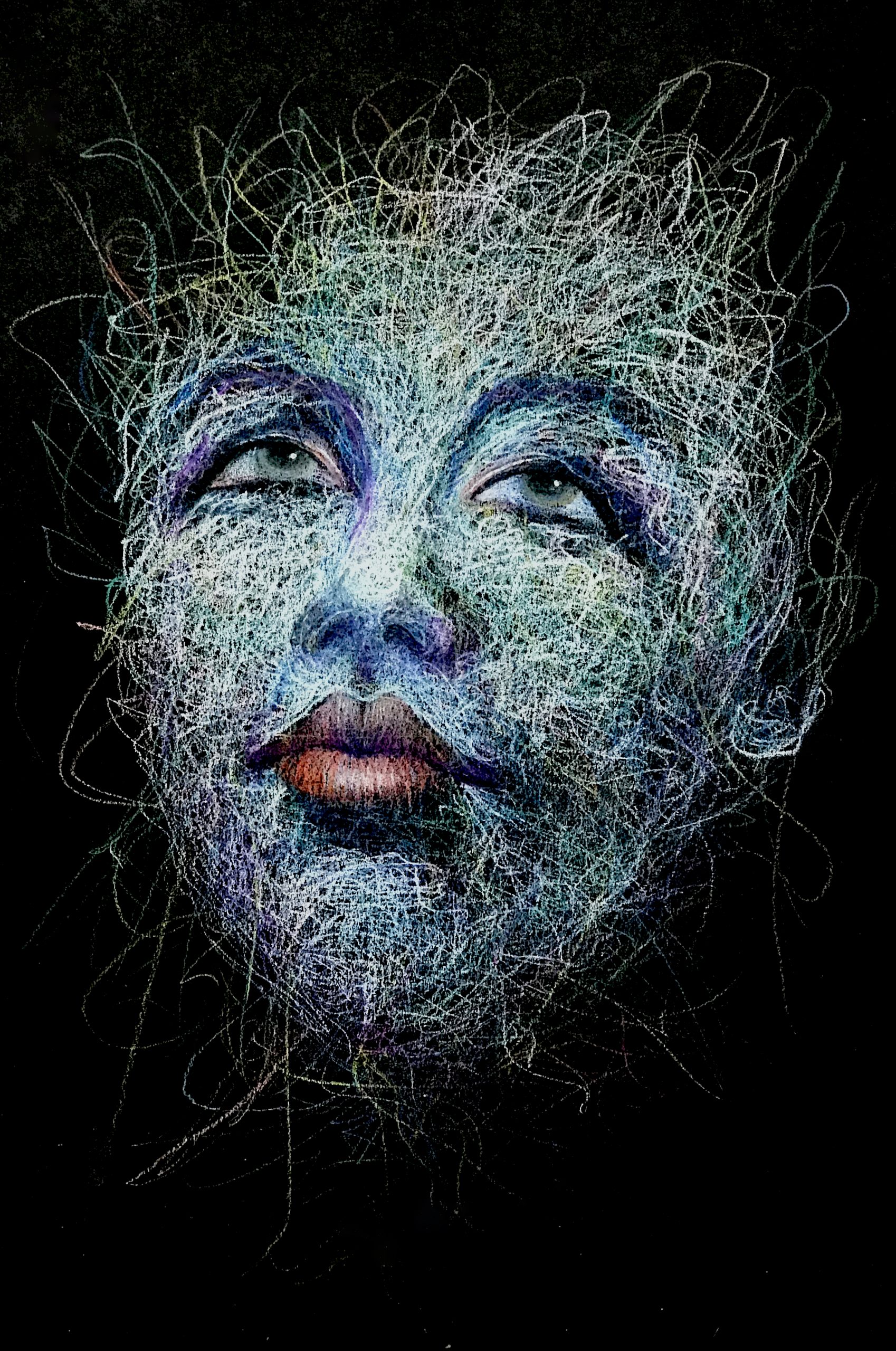 Continuous line scribble drawing on Daler Rowney black paper, using Derwent crayons
