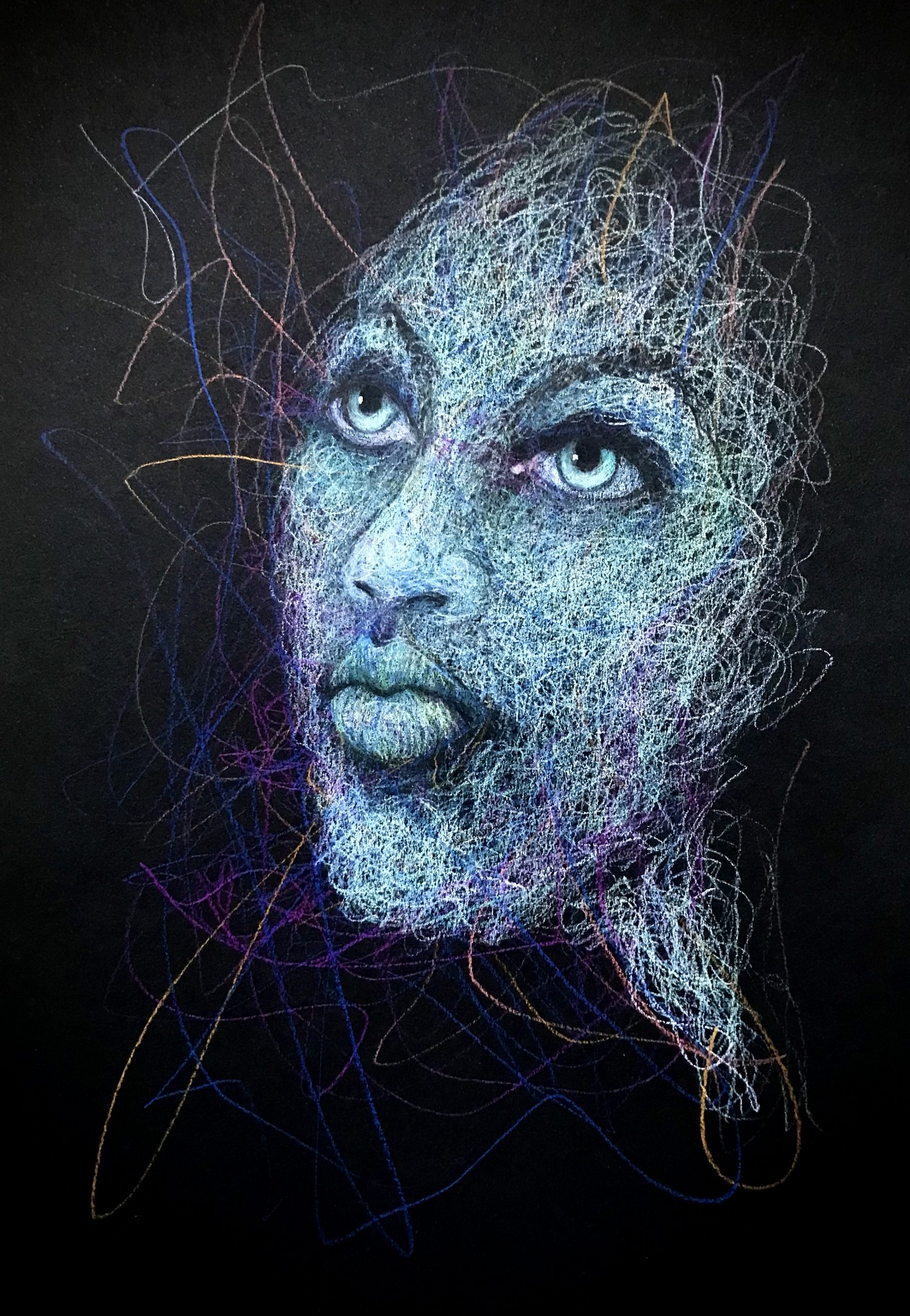 Continuous line scribble drawing on Daler Rowney black paper, using Derwent crayons