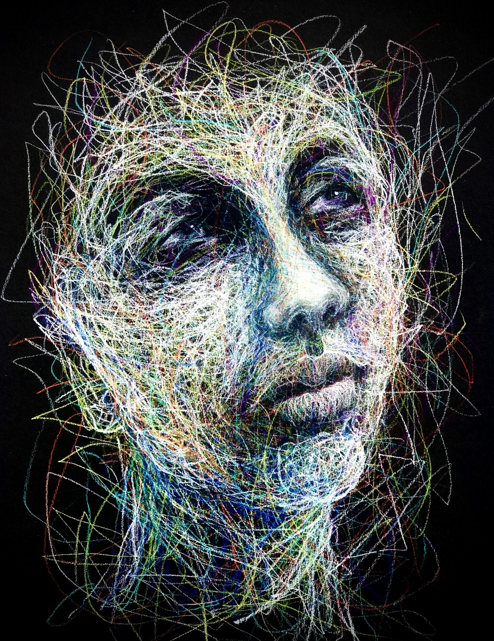 Continuous line scribble drawing on Daler Rowney black paper, using Derwent crayons