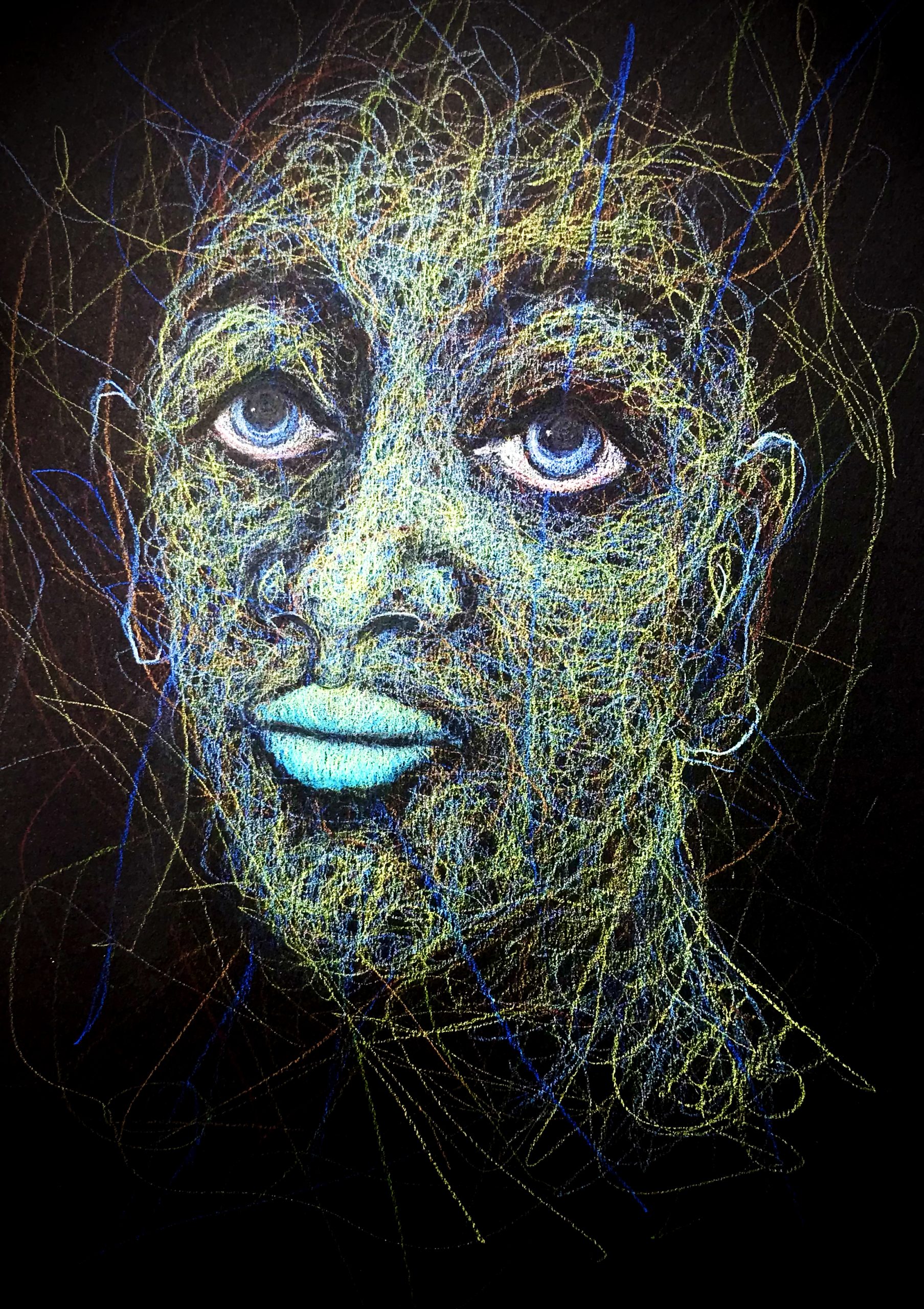 Continuous line scribble drawing on Daler Rowney black paper, using Derwent crayons