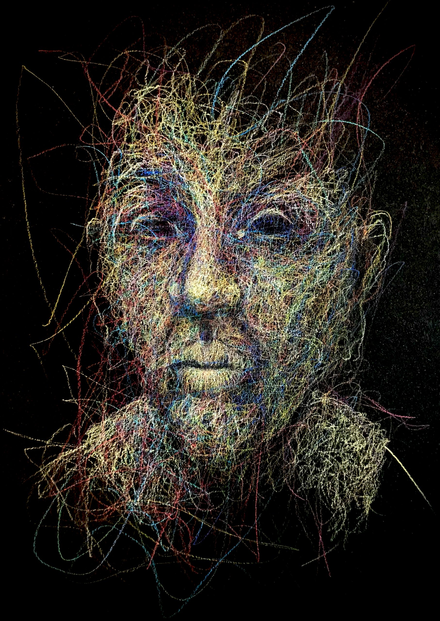 Continuous line scribble drawing on Daler Rowney black paper, using Derwent crayons
