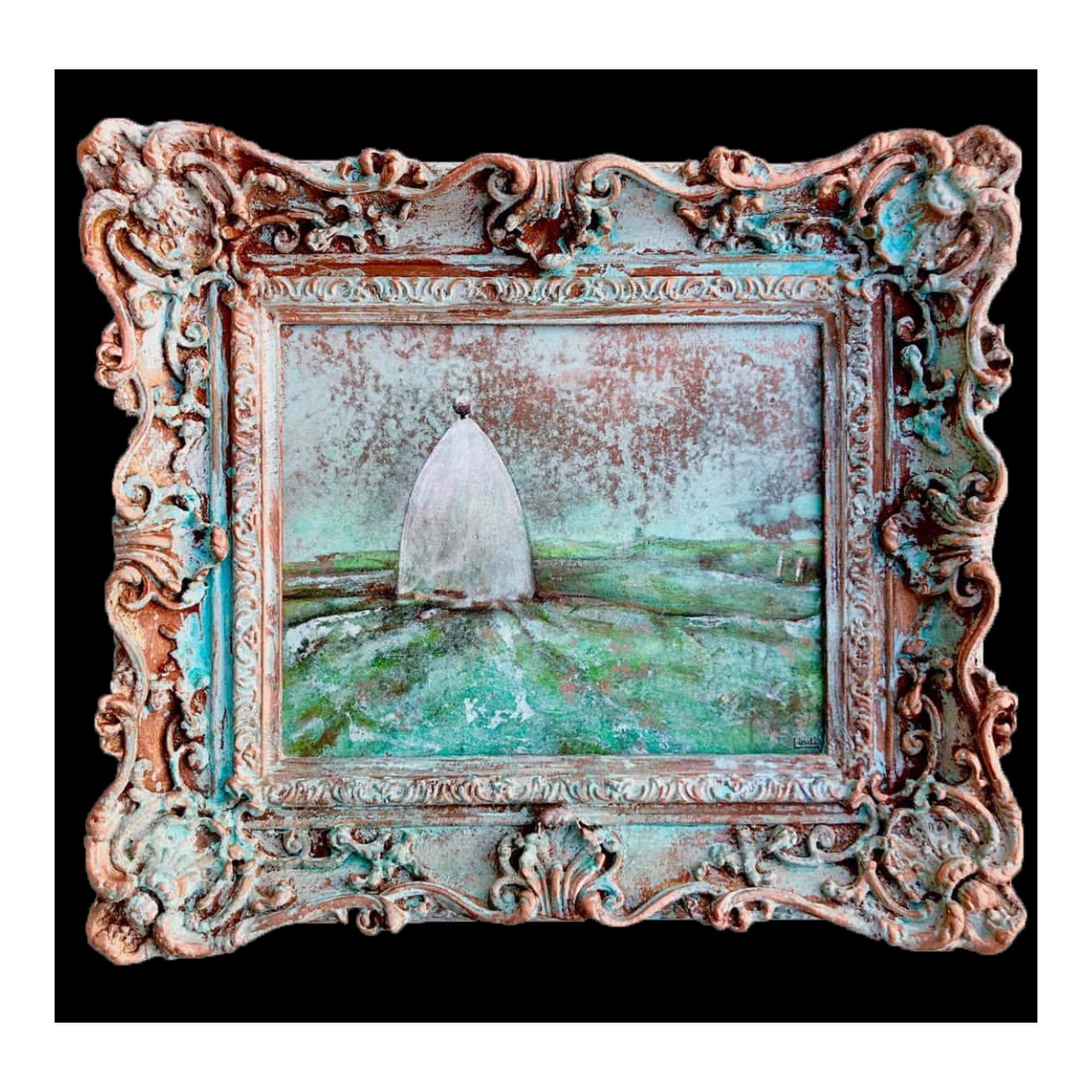 White Nancy is a structure at the top of Kerridge Hill, overlooking Bollington, Cheshire, England. Since 1966 it has been recorded in the National Heritage List for England as a designated Grade II listed building. Its profile forms the logo for the town of Bollington. I am often asked to paint White Nancy as it’s a place dear to my heart and very near my home. Each painting I do of it is completely different to any others, to keep to uniqueness. This one has been painted using solely rust effect paints, even the frame.